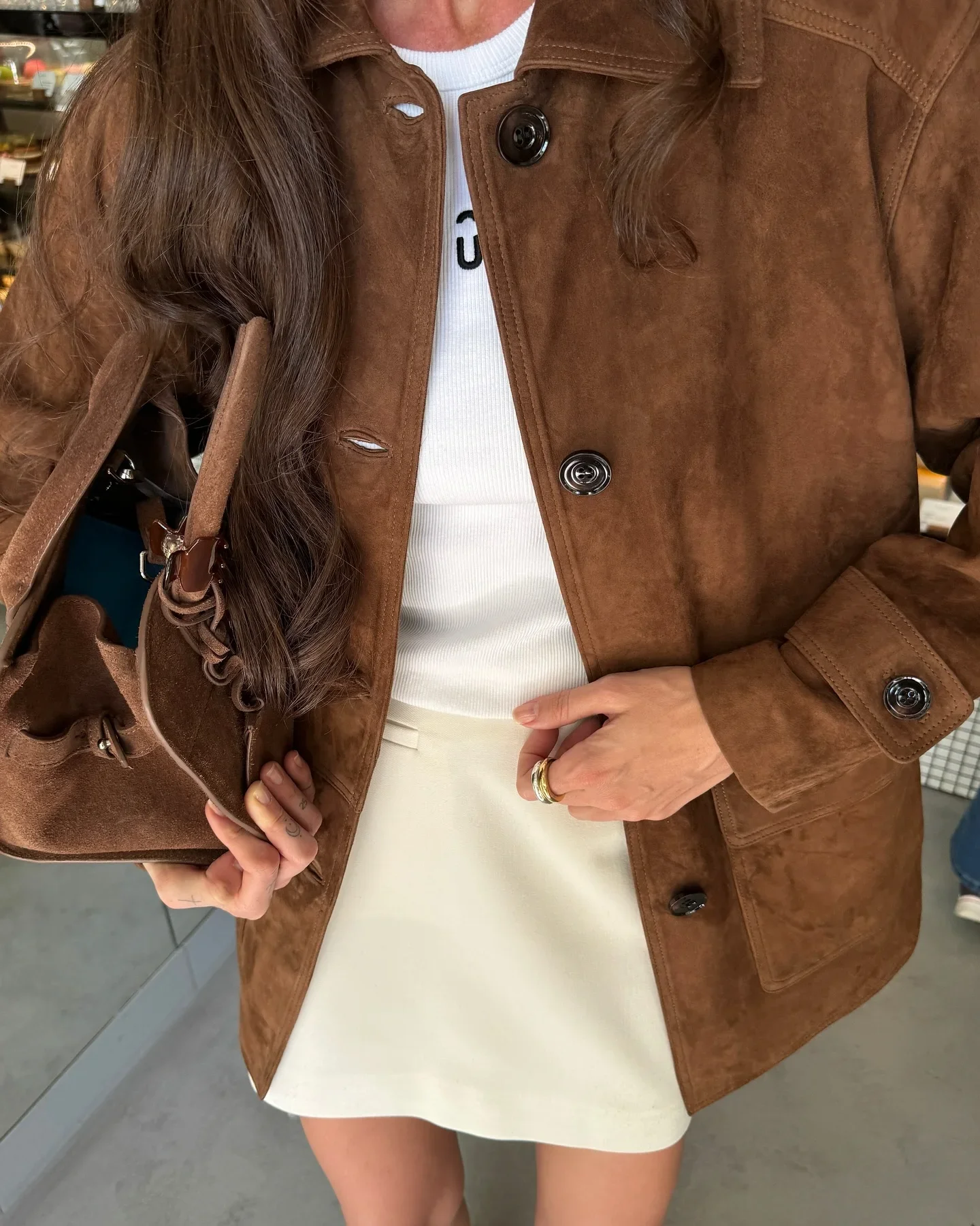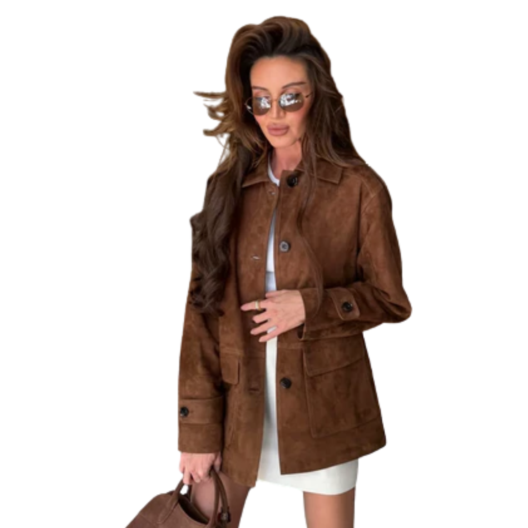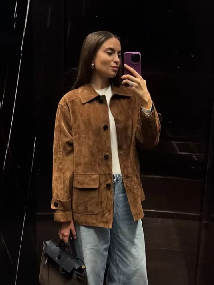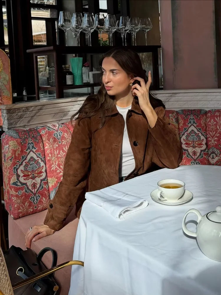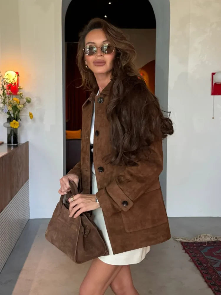 Elevate your wardrobe with this retro brown suede jacket, designed to combine comfort, elegance, and versatility. Its structured collar, high-quality material, and carefully tailored details make it a standout piece for everyday chic looks. Ideal for layering over dresses or pairing with jeans, it adds a refined yet effortless touch to any outfit.